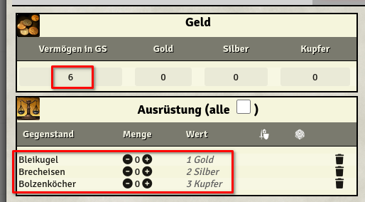 Oops, da hat der Zwerg wohl nur an das wesentliche gedacht, hab nicht mit Silber & Kupfer bei Gegenständen getestet, da mir das für das Vermögen nicht in den Sinn kam, schaue direkt heut Abend nach ob ich die currency abfragen & integrieren kann.