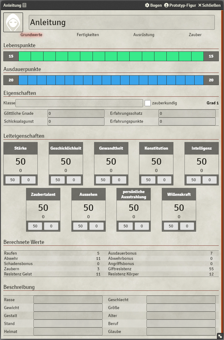Leiteigenschaften werden in ihrer jeweiligen Kachel durch das Eingabefeld unten links gesetzt. Das Eingabefeld daneben kann genutzt werden, um einen temporären Bonus oder Malus einzutragen.